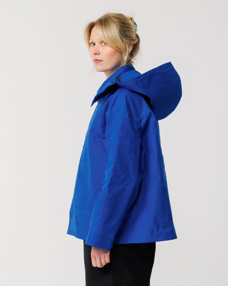 Our Cobalt Blue Detachable Hood is the perfect complement to your Nell Jacket, combining functionality with sophisticated design. Crafted from the same premium Scottish dry-waxed cotton as the jacket, it ensures consistent protection and style. The innovative tyre panel design and double-layered construction offer superior coverage, while multiple adjustment points allow for a customised fit around your face. Attaches seamlessly to your Nell Jacket with discrete poppers.
