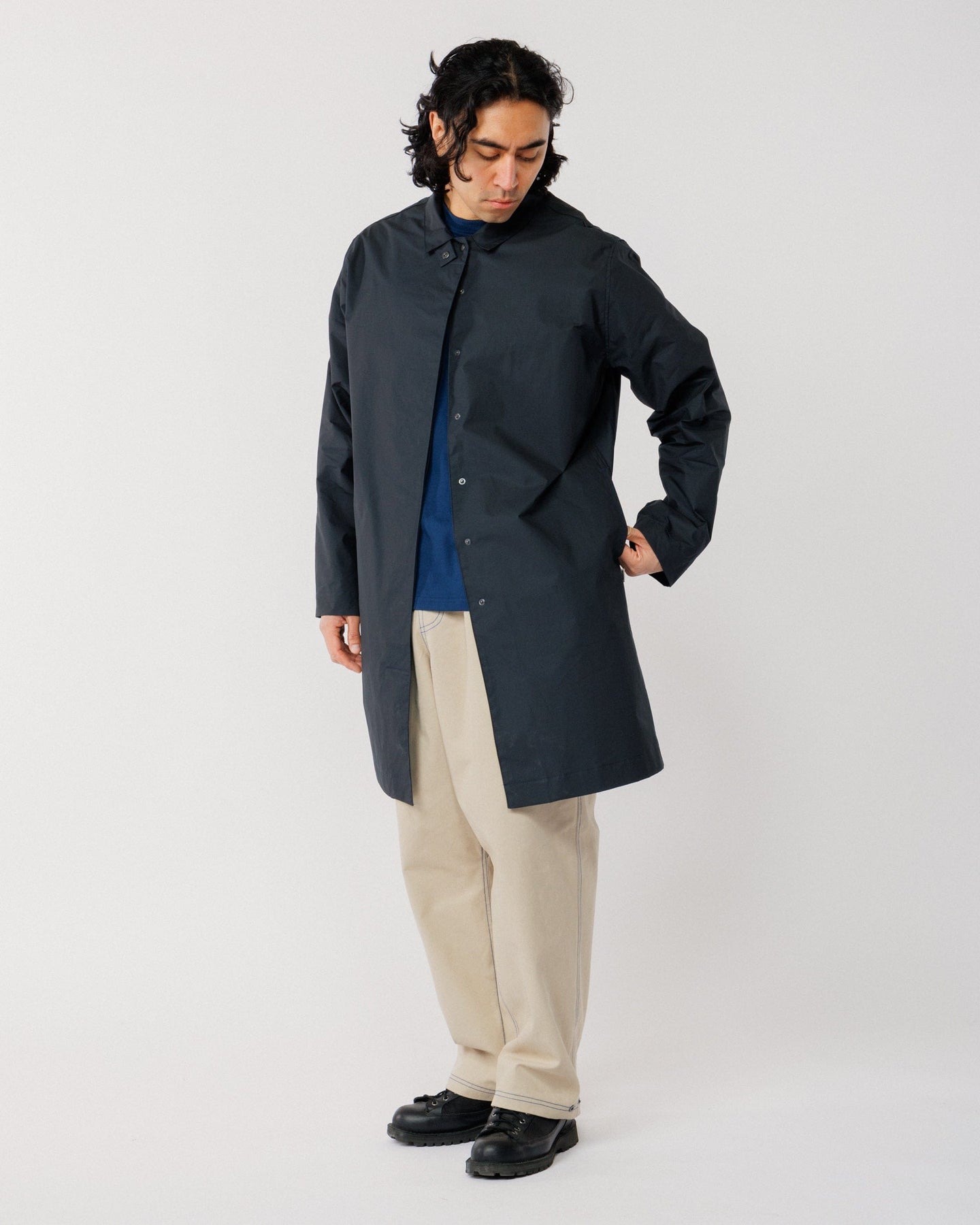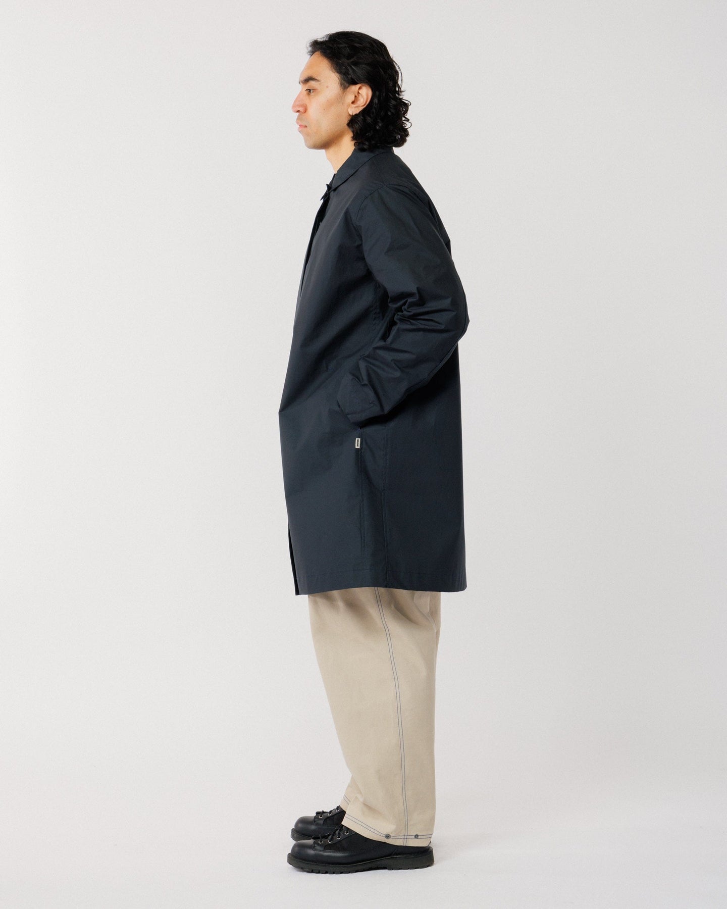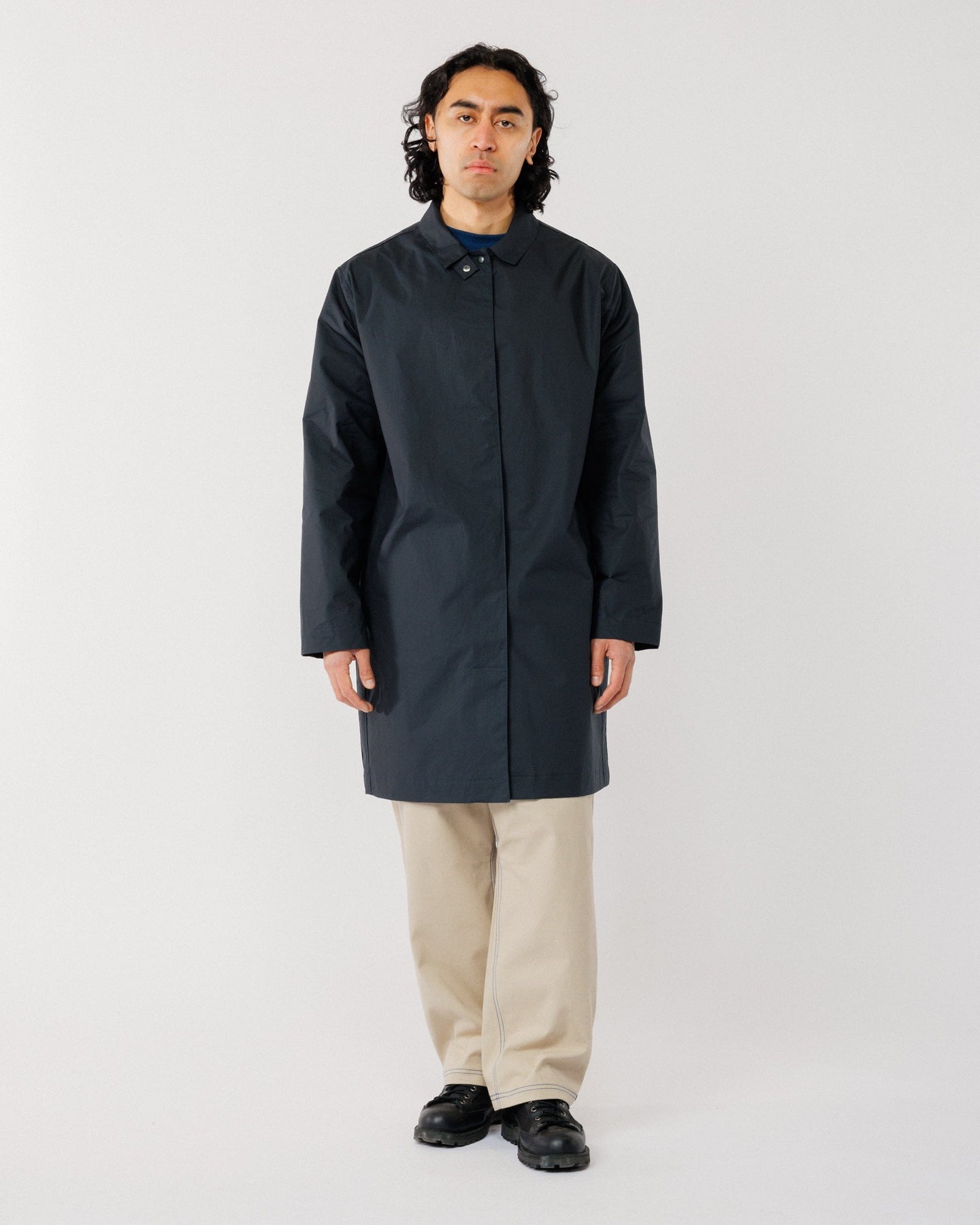 The cut is minimal yet slightly elevated, designed to layer effortlessly over your everyday staples. Deep side pockets provide practical storage, while an optional storm flap at the collar fastens into a protective funnel neck or can be worn open for a relaxed, modern look.