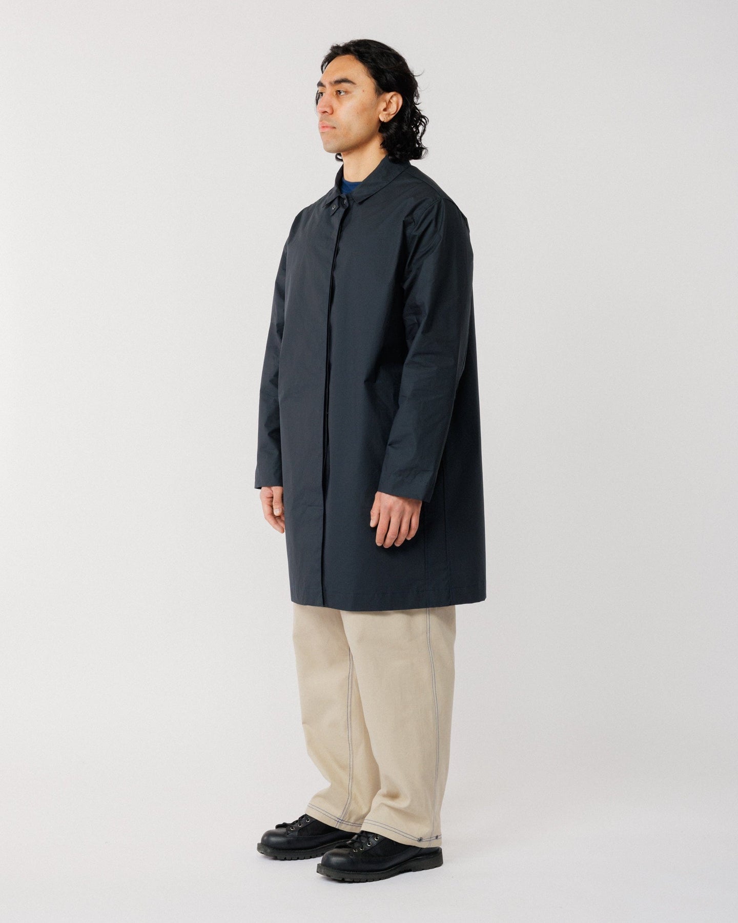 Crafted from organic Bio Nova waxed cotton by Halley Stevensons - specialists in weatherproof textiles since 1864 - this premium fabric features a bio-based, fluorocarbon-free (FCF) coating. The result is a breathable, lightweight mac with a subtle technical feel that keeps you dry in a shower without the bulk of a traditional waxed jacket.