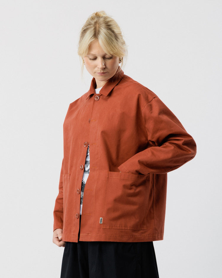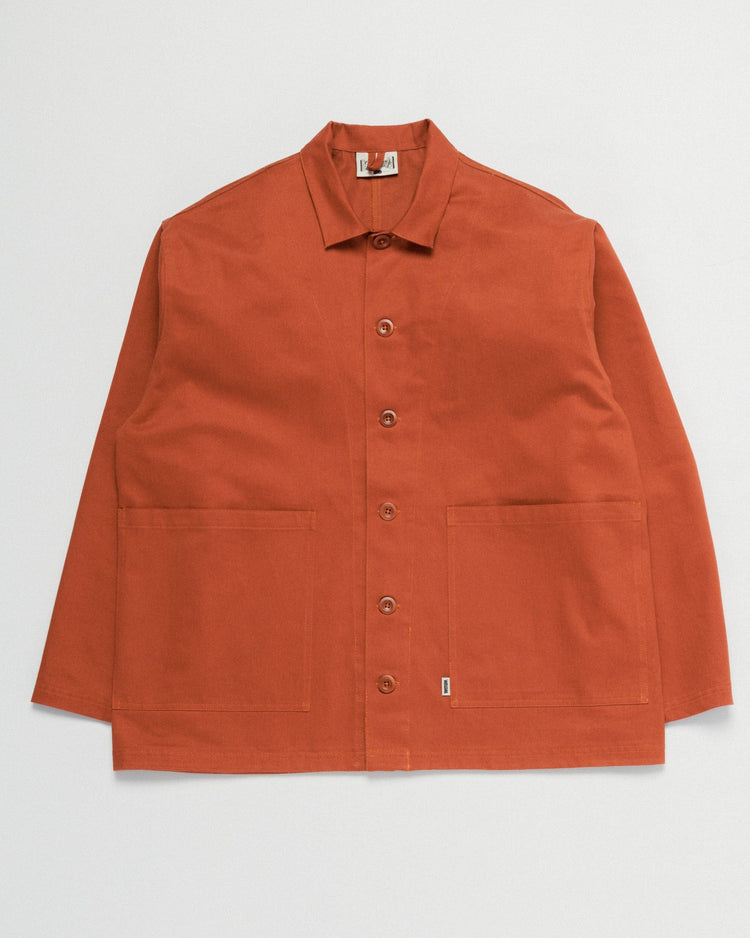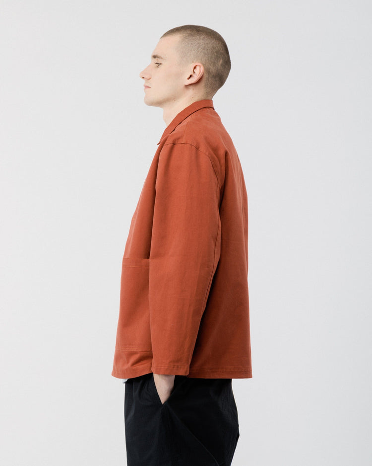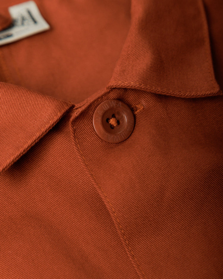 Our Mill Overshirt in rust reinterprets the classic chore jacket with thoughtful design and durable, high-quality materials. Made from mid-heavyweight BCI cotton twill, it’s chosen for strength, wind resistance, and the way it softens beautifully over time, getting even better the more you wear it.