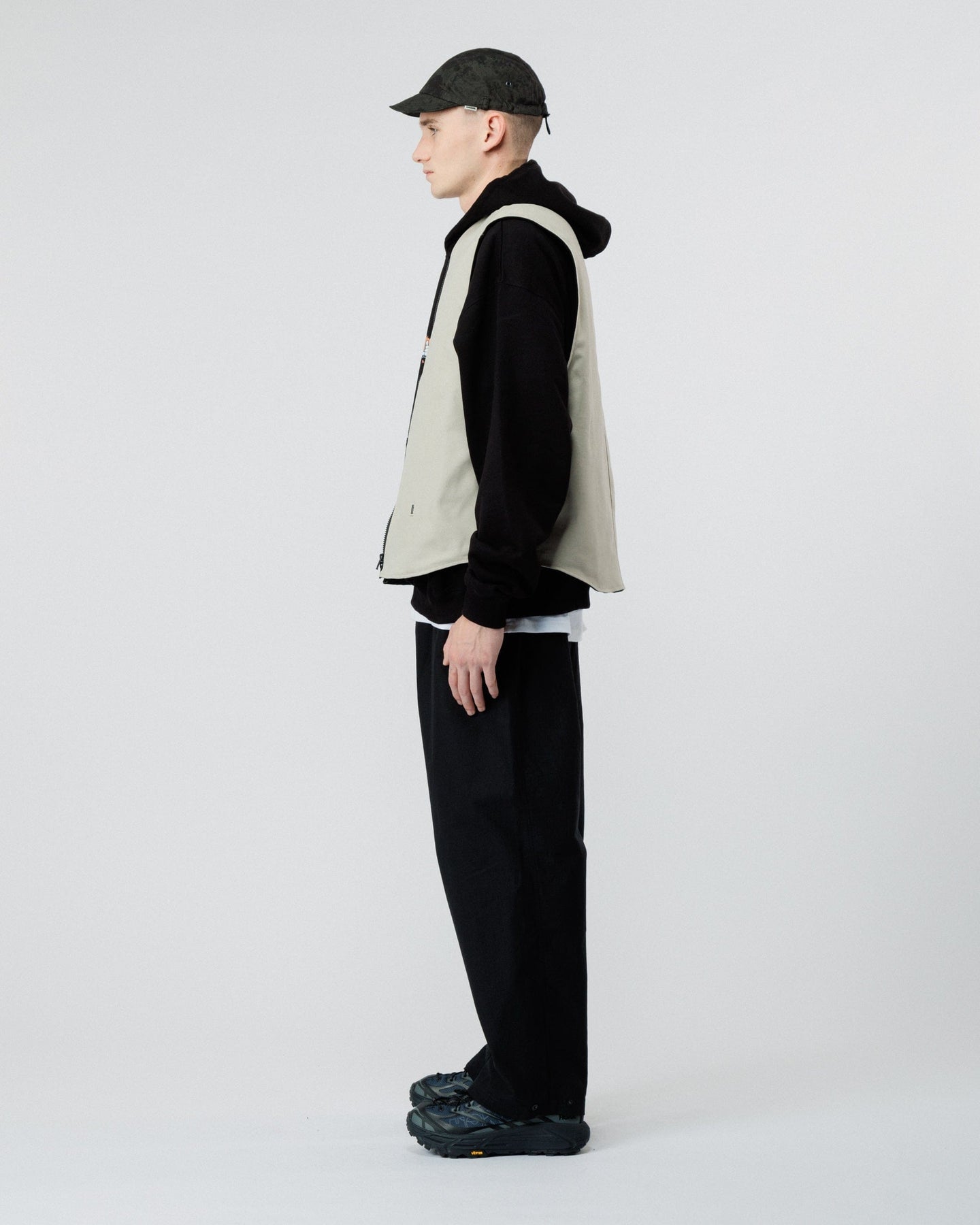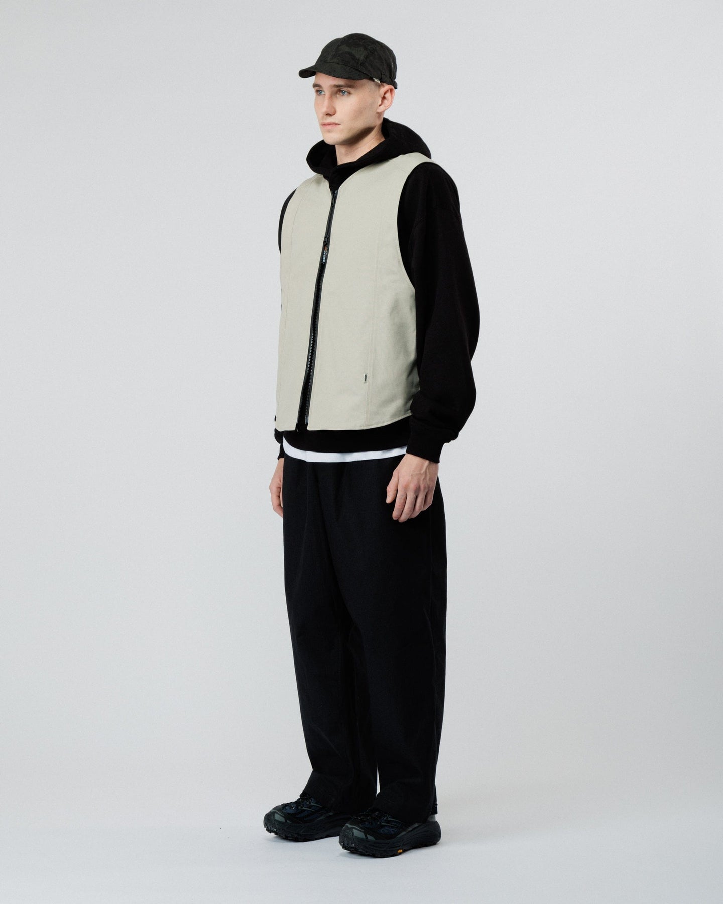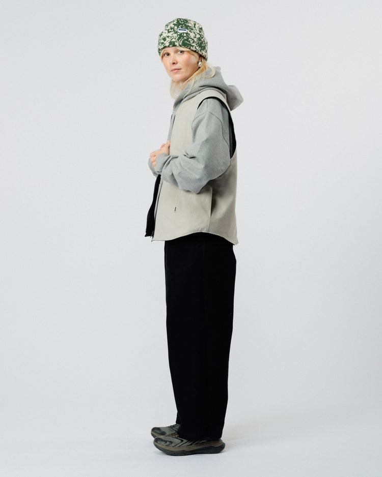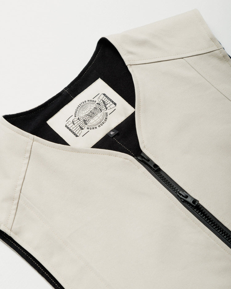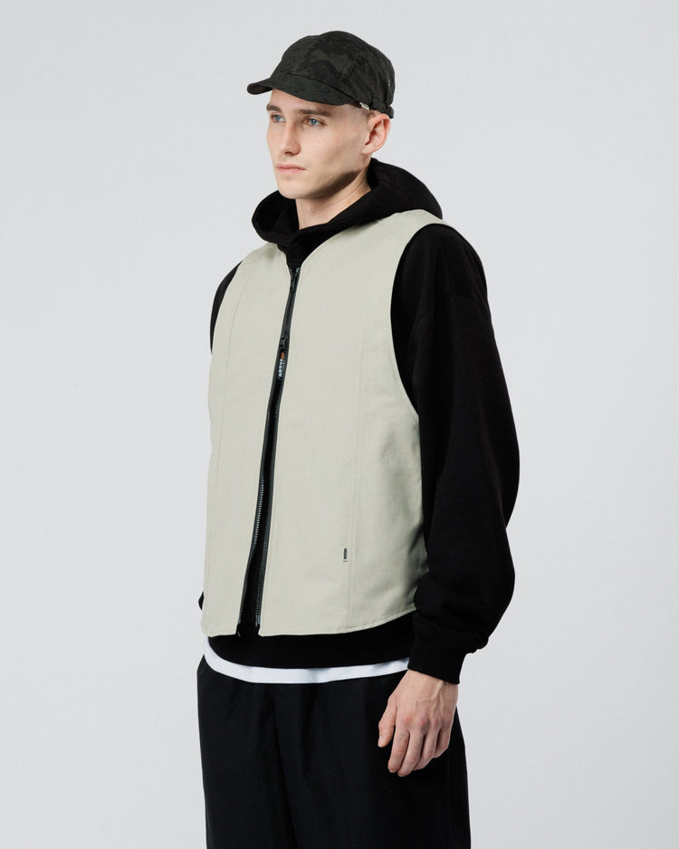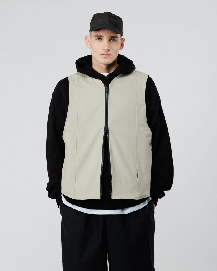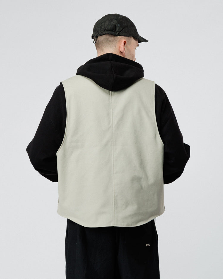 The moleskin-lined inseam pockets provide both comfort and extra warmth for cold hands, while the exterior is crafted from heavyweight BCI (Better Cotton Initiative) cotton canvas, chosen for its durability and clean, structured look. Subtle split-seam detailing gives the vest a considered finish without detracting from its minimal silhouette.