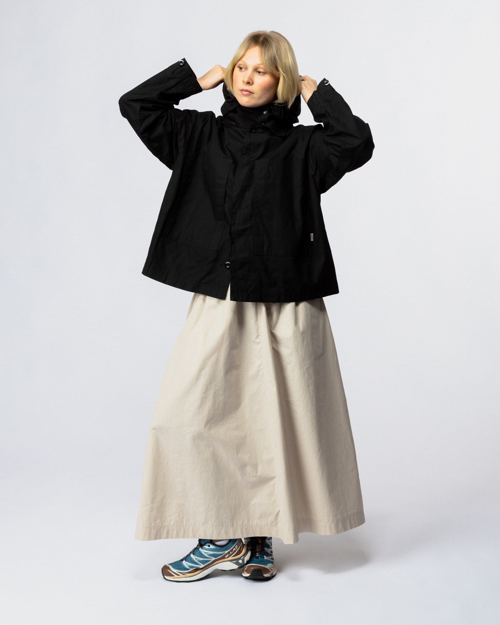 GREAT skirt! Love the heavy cotton. It feels very high quality, and it's a versatile addition to my wardrobe - simple, flexible and I expect to get a lot of wear out of it. I've been wearing it with loafers & socks, and I expect to pair it with boots as the weather gets colder. I was a little concerned about the sizing as I am at the top of the M size range, but it fits comfortably with the elasticated waistband. I'm 5'5" but I don't feel swamped in it, it hits just above my ankle.