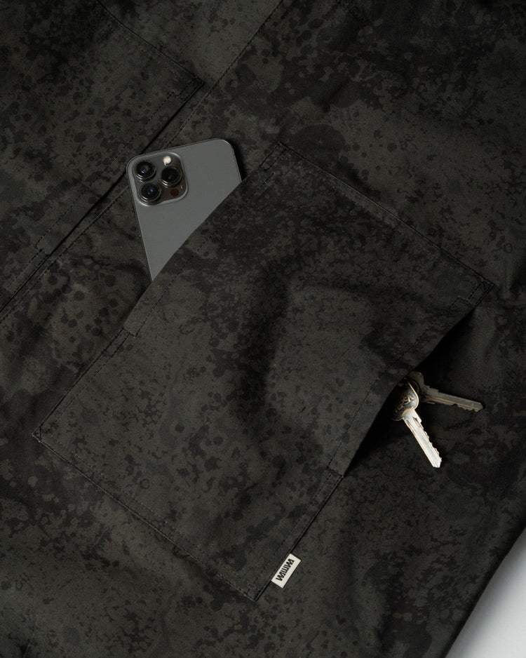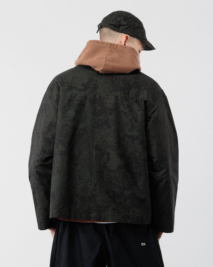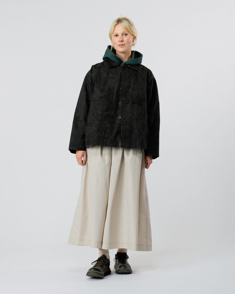 Our Limited Edition Nell Jacket combines everyday practicality with statement style. Crafted in a subtle Black Ink print on premium Scottish dry-waxed cotton canvas, the fabric evokes a textured, organic pattern reminiscent of ink dispersing through water, bringing a contemporary edge to a classic utilitarian design.