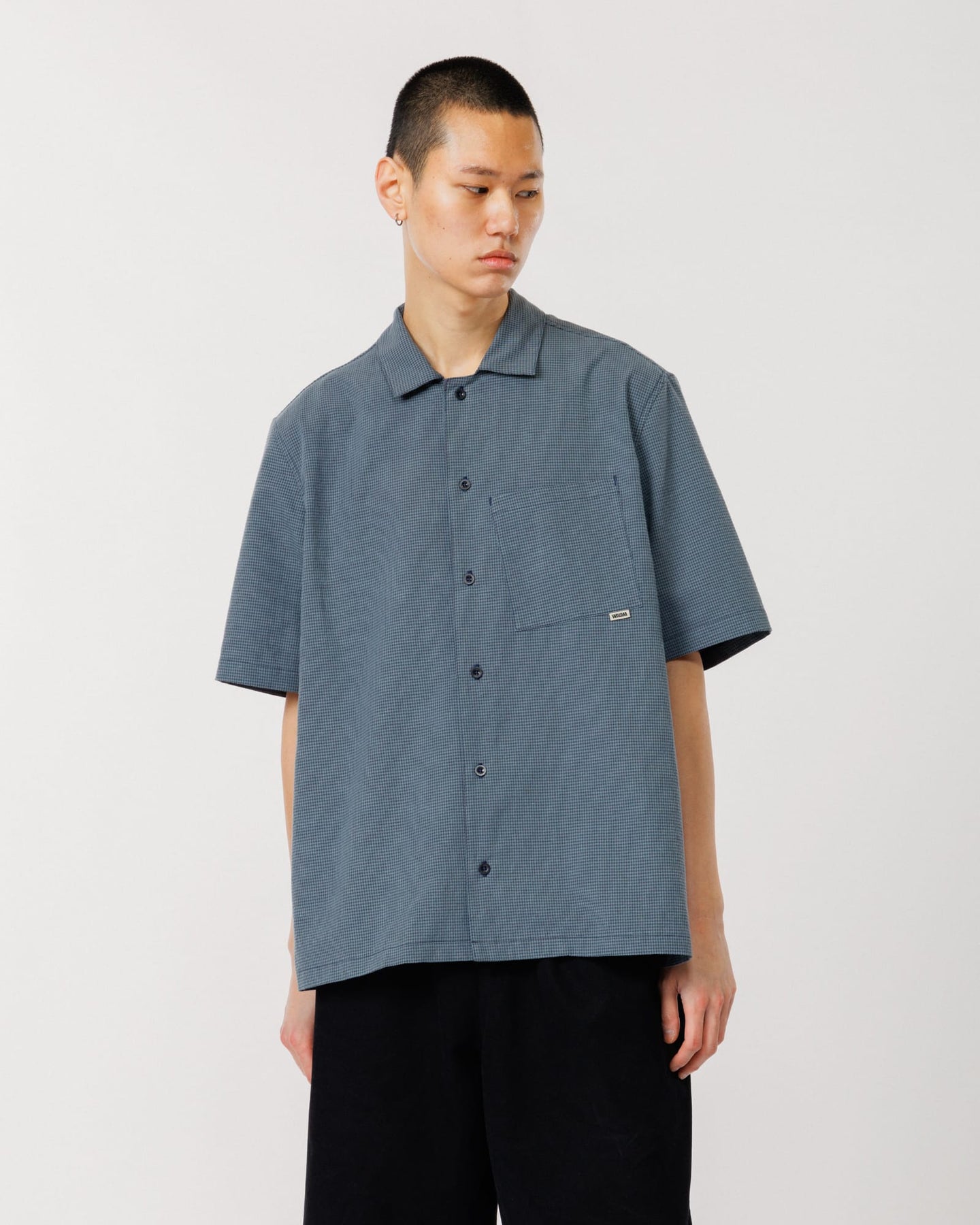 Our classic Ezra Shirt in, re-imagined in a lightweight navy/blue checked fabric for summer. Cut in our signature boxy, relaxed fit and made from a breathable organic cotton and recycled polyester blend.